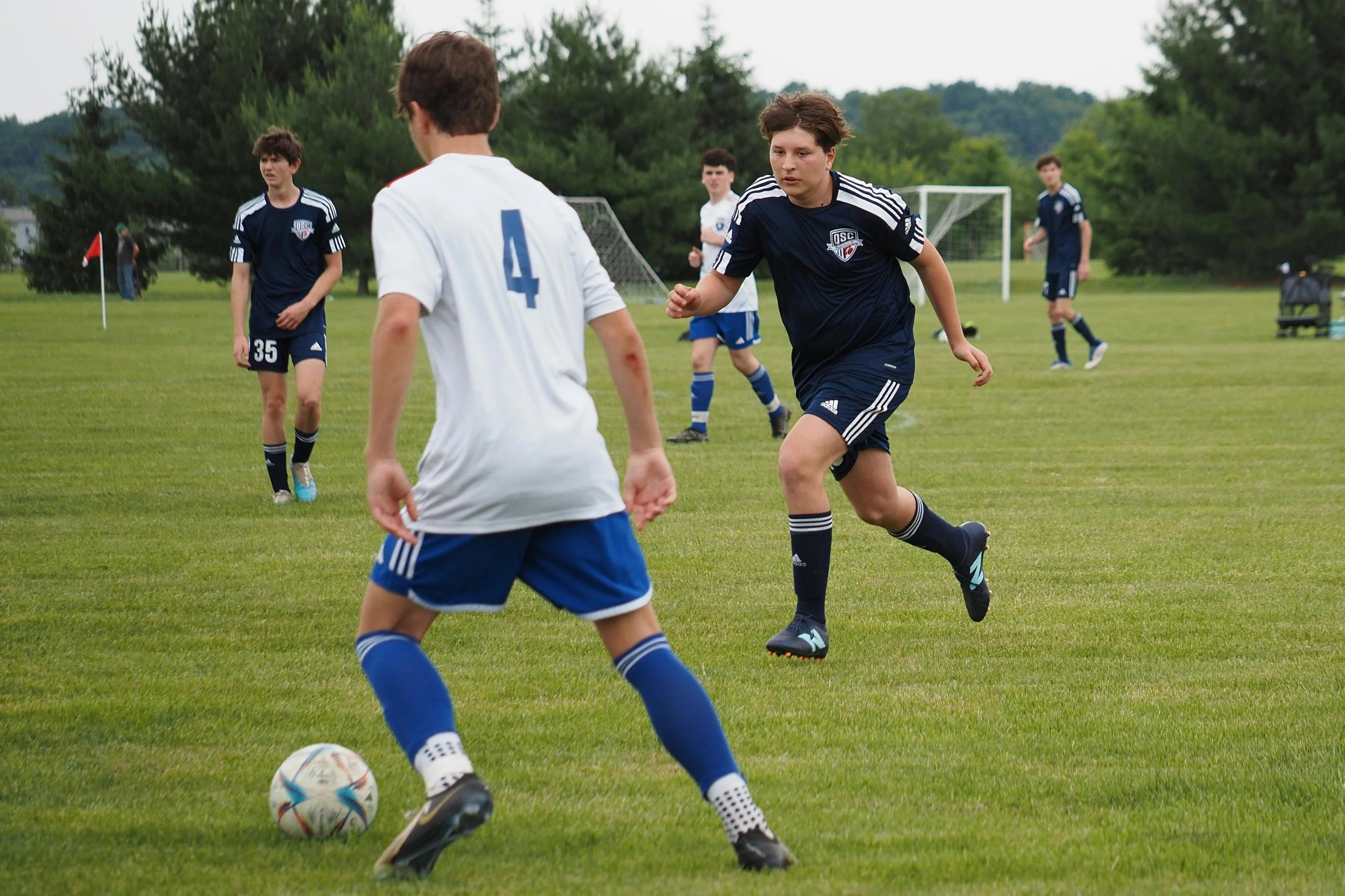 You can run towards them to cut off space, but stop when you get about three to four feet in front of them. In most cases, the fullback will hesitate because they don’t want to get into a 1v1 with you and risk giving up the ball without support.